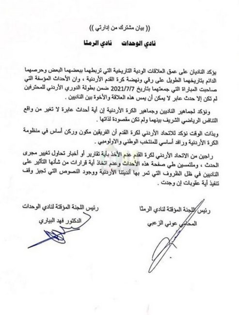 جاء ذلك عبر البيان المشترك الذي حمل توقيع رئيسي الناديين الدكتور فهد البياري والمحامي عوني الزعبي، وجرى فيه التأكيد على أن الأحداث التي شهدتها مباراة الفريقين في الموقعة المؤجلة من الجولة الثانية لدوري المحترفين لكرة القدم عابرة ولا يمكن بأي حال من الأحوال أن تؤثر على الروابط القوية التي تجمع الناديين، وفيما يلي نص البيان:
