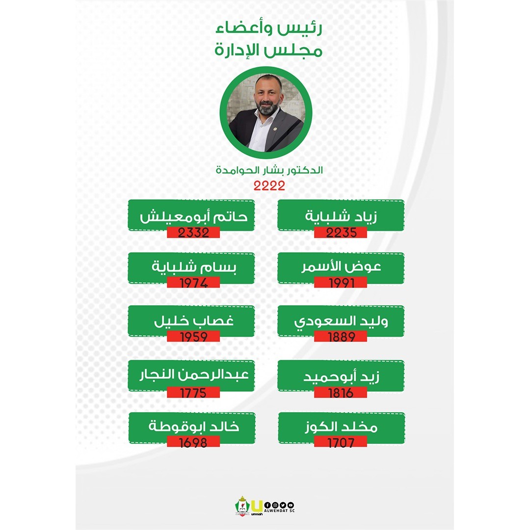 ظفر د.بشار حوامدة برئاسة نادي الوحدات وجمع (٢٢٢٢) صوتا بعد أن تفوق على منافسه في سباق الرئاسة يوسف الصقور والذي جمع (١٨٢٦)صوتا.