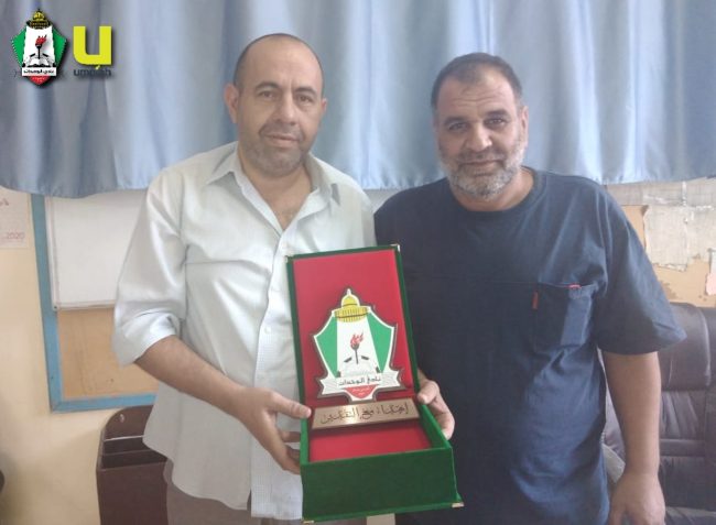 كرمت الهيئة الإدارية المؤقتة لنادي الوحدات، مراقبي مكتب صحة وكالة الغوث في مخيم الوحدات، كل من المراقب مصطفى الدوخ، والمراقب خالد بوادي، تقديرا لجهودهما بالإشراف على تعقيم أروقة مقر نادي الوحدات مؤخرا.