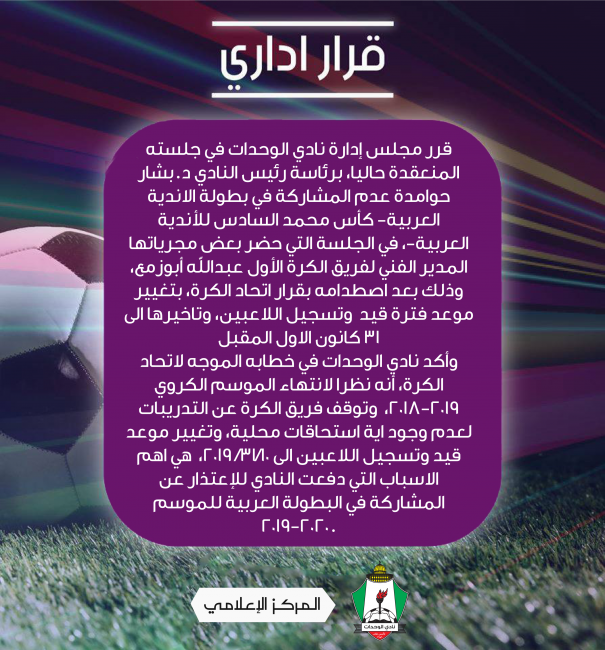 الرئيسية/قرارات مجلس الادارة/قرار إداري | الوحدات يقرر عدم المشاركة في البطولة العربية قرارات مجلس الادارة قرار إداري | الوحدات يقرر عدم المشاركة في البطولة العربية طارق عواديوليو 15, 2019 538 طارق عواديوليو 15, 2019 538 فيسبوك تويتر ماسنجر ماسنجر واتساب تيلقرام مشاركة عبر البريد طباعة