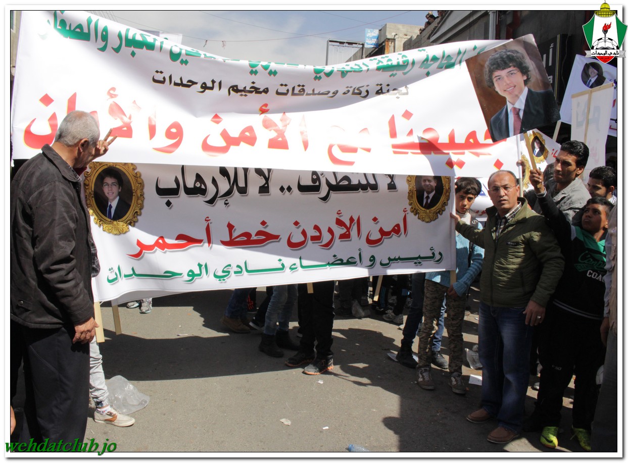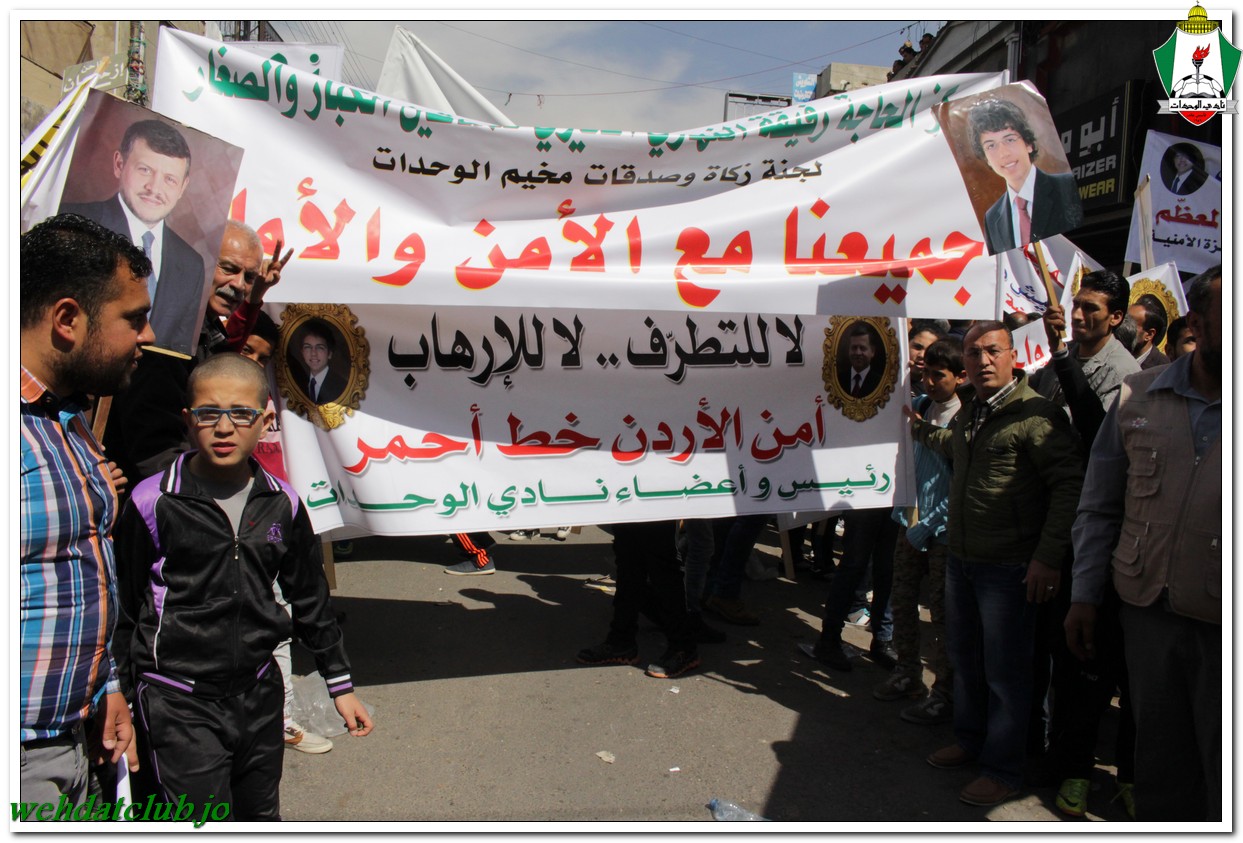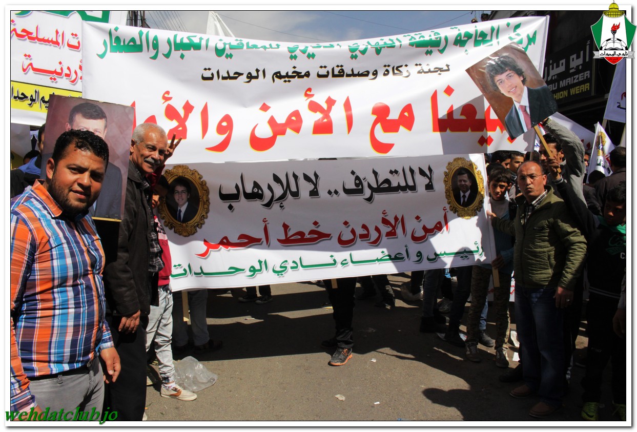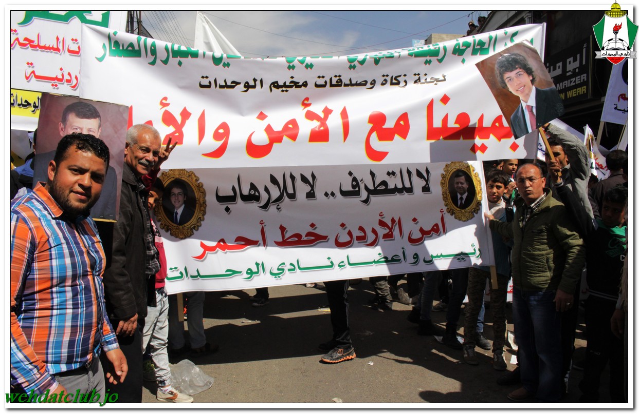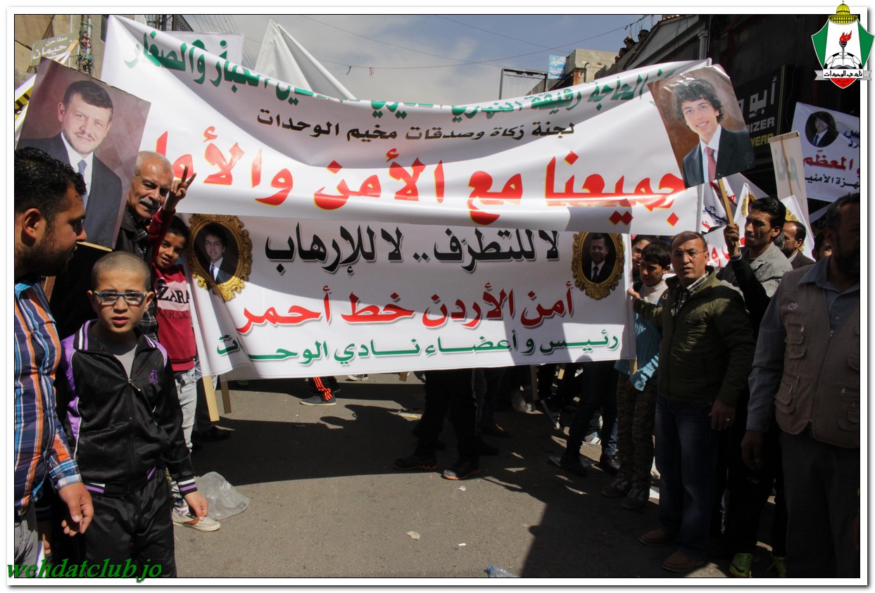 أكد أهالي مخيم الوحدات وفعالياته الشعبية عن وقوفهم وتأيدهم لجلالة الملك عبد الله الثاني بن الحسين المعظم، وللقوات الأمنية ورفضها التام والقاطع للتطرف والإرهاب، وذلك خلال المسيرة الجماهيرية الكبيرة التي انطلقت من أمام مبنى لجنة الخدمات في شارع سمية مروراً بنادي الوحدات وحتى الوصول إلى المركز الأمني.
