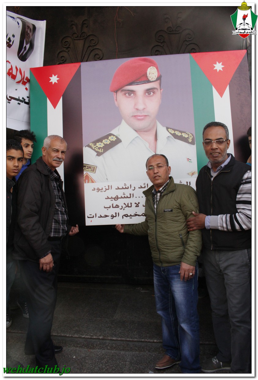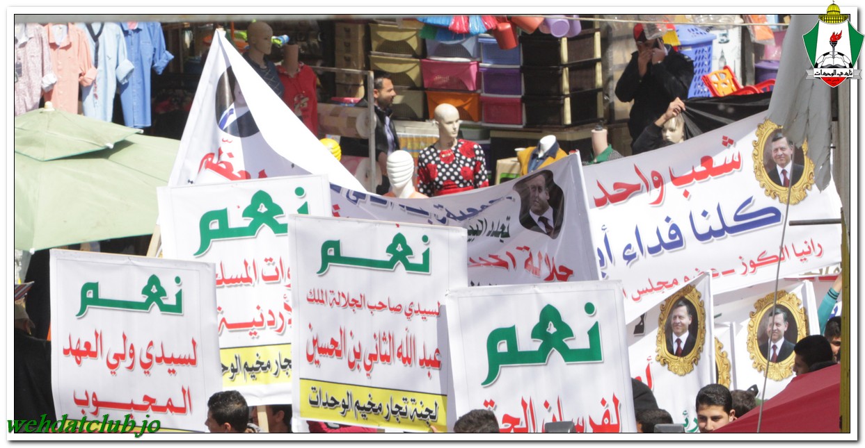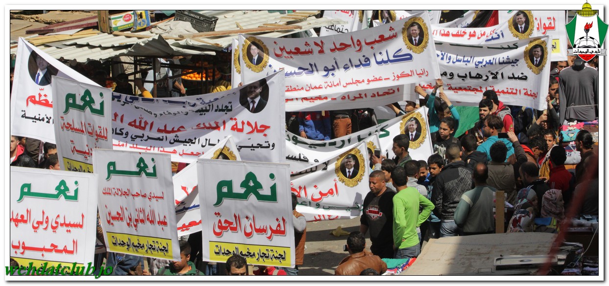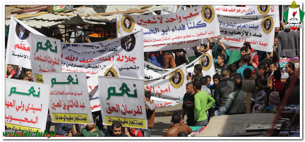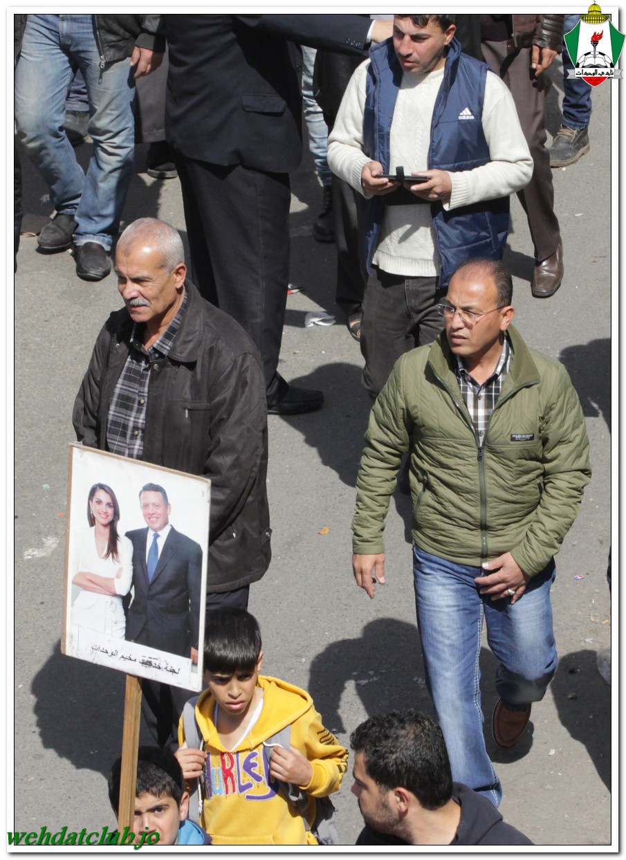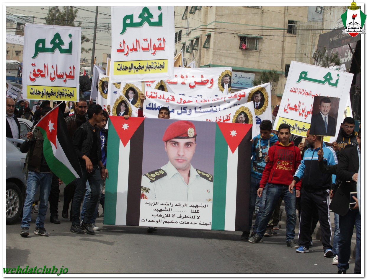 أكد أهالي مخيم الوحدات وفعالياته الشعبية عن وقوفهم وتأيدهم لجلالة الملك عبد الله الثاني بن الحسين المعظم، وللقوات الأمنية ورفضها التام والقاطع للتطرف والإرهاب، وذلك خلال المسيرة الجماهيرية الكبيرة التي انطلقت من أمام مبنى لجنة الخدمات في شارع سمية مروراً بنادي الوحدات وحتى الوصول إلى المركز الأمني.