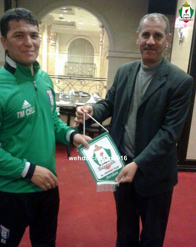 كرم نادي الوحدات الوفد الإداري لنادي التين أسير التركماني مساء اليوم في مكان إقامة الوفد ممثلة بعضوي مجلس الإدارة كلا من المنسق الإعلامي بسام شلباية ومدير العلاقات العامة سامي دحبور من خلال تقديم درع وشعار النادي وذلك قبل توجه الوفد الضيف والعودة إلى تركمانستان تعبيراً من نادي الوحدات عن مدى العلاقة الطيبة والإحترام والتقدير لهم خلال تواجدهم في الأردن بعد اللقاء الذي جمع الفريقين مساء اليوم على ستاد عمان الدولي ضمن بطولة كأس الإتحاد الآسيوي 2016 والذي إنتهت نتيجته إيجابية بهدف لهدف.