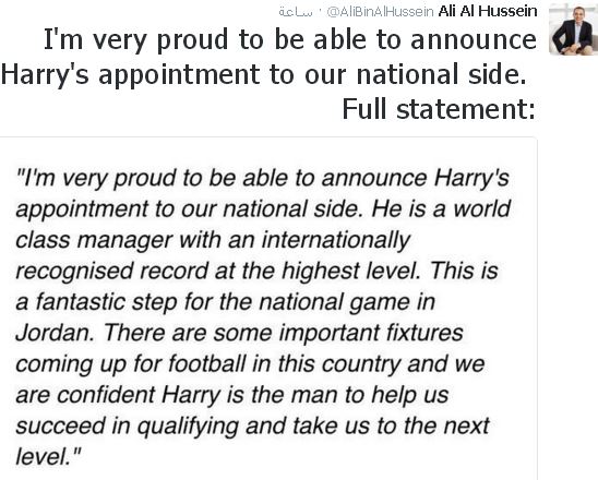 وأضاف الأمير:” هي خطوة رائعة بالنسبة لكرة القدم الأردنية، وكلنا ثقة بقدرة المدرب هاري على مساعدتنا في اجتياز المرحلة المقبلة”.