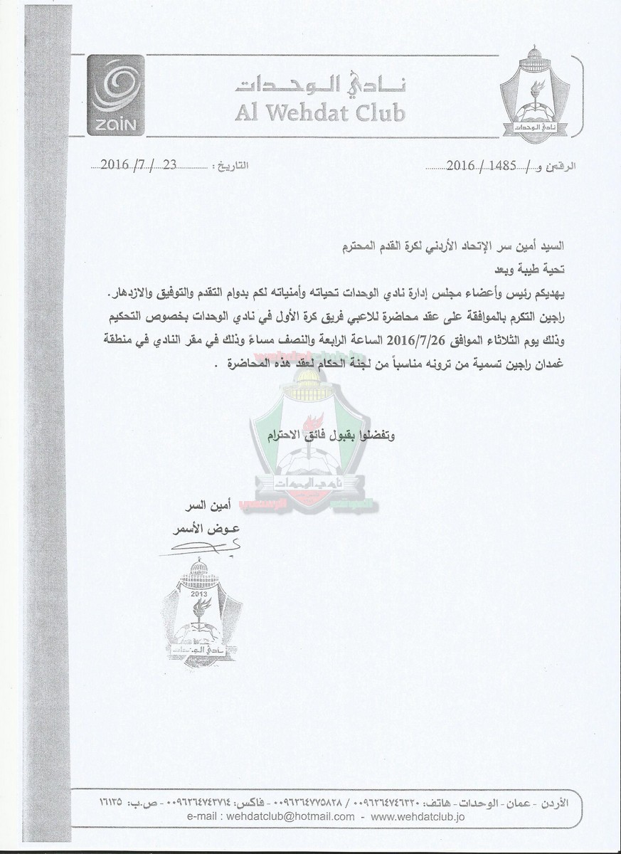 تعقد لجنة حكام الإتحاد الأردني لكرة القدم محاضرة بخصوص التحكيم للاعبي الفريق الأول بمقر النادي بمنطقة غمدان يوم الثلاثاء القادم 26-7-2016 الساعة 4.30 مساءا.ً