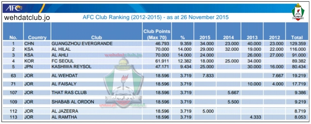 تصدر نادي الوحدات الأندية الأردنية في آخر تصنيف للأندية الآسيوية في إحصائية للإتحاد الآسيوي في الموسم السابق التي صدرت على موقع الإتحاد الآسيوي بتاريخ 26/11/2015 حيث من المتوقع أن يصدر التصنيف الجديد للأندية خلال الأشهر القادمة لموسم 2016-2017.