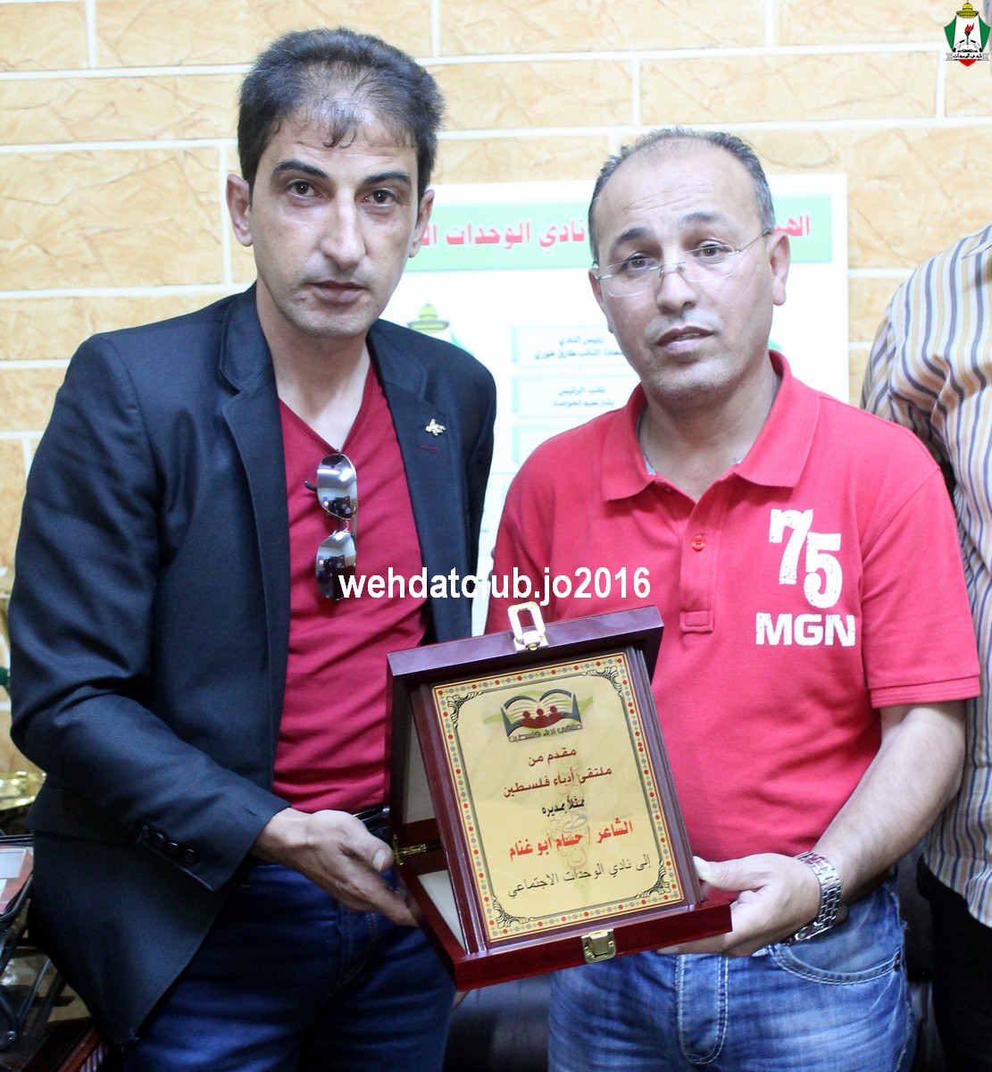 قام مدير ملتقى أدباء فلسطين في مدينة جنين حسام أبو غنام بعمل زيارة خاصة إلى نادي الوحدات لتقديم درع ملتقى الأدباء الفلسطينين تكريماً لدور نادي الوحدات الريادي في دعم الأدب الفلسطيني.
