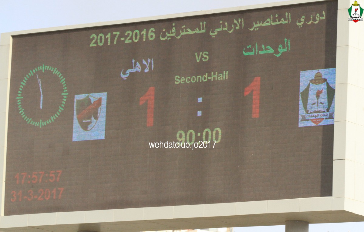 تعادل الوحدات مع نظيره الاهلي بهدف لهدف في المباراة التي اقيمت على ستاد الملك عبدالله الثاني في منطقة القويسة مساء اليوم بافتتاح الاسبوع السابع عشر من عمر دوري المناصير الاردني للمحترفين 2016/2017.