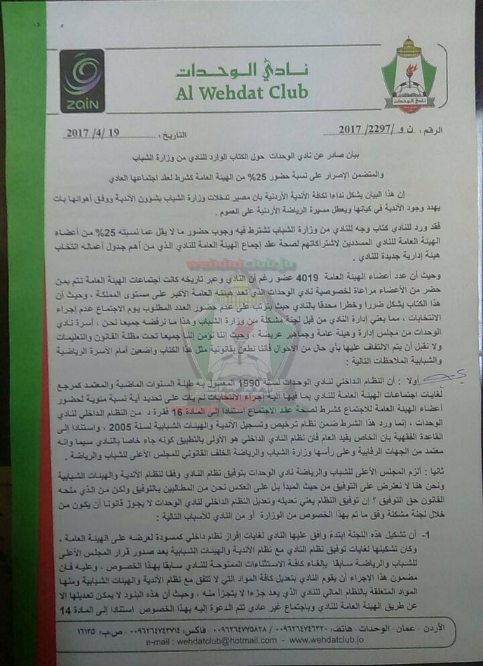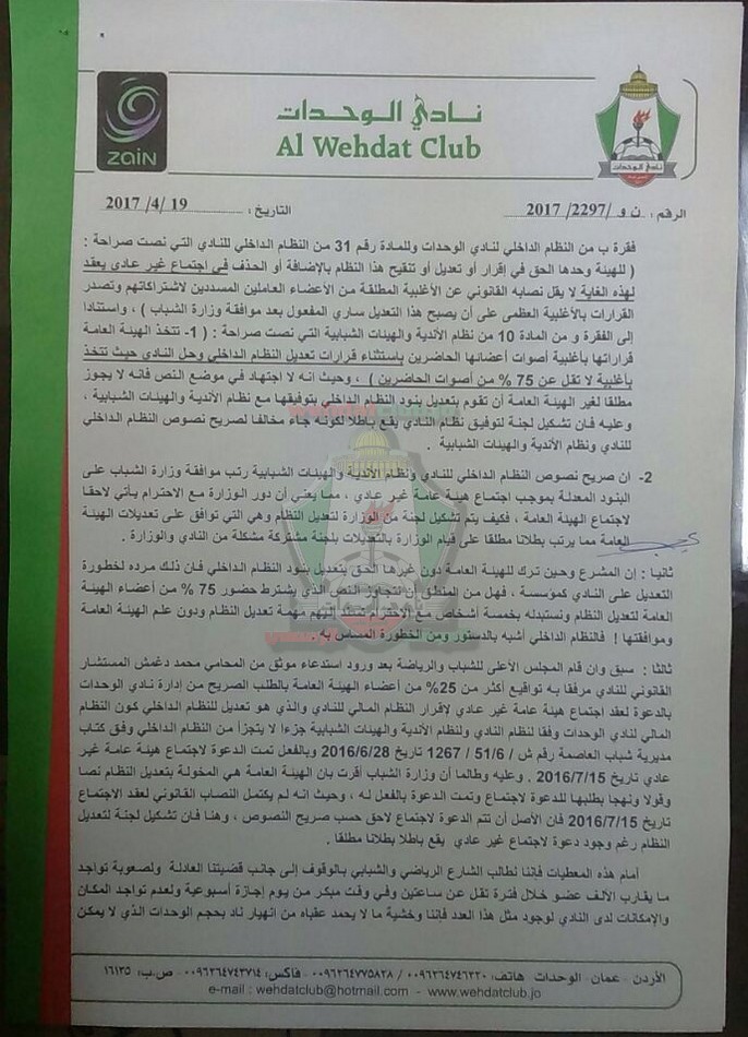 وحيث أن عدد أعضاء الهيئة العامة 4019 عضو رغم أن النادي وعبر تاريخه كانت اجتماعات الهيئة العامة تتم بمن حضر من الأعضاء مراعاة لخصوصية نادي الوحدات الذي تعد هيئته العامة الأكبر على مستوى المملكة ، وحيث أن هذا الكتاب يشكل ضررا وخطرا محدقا بالنادي حيث يترتب على عدم حضور العدد المطلوب يوم الاجتماع عدم إجراء الانتخابات ، مما يعني إدارة النادي من قبل لجنة مشكلة من وزارة الشباب وهذا ما نرفضه جميعا نحن ، أسرة نادي الوحدات من مجلس إدارة وهيئة عامة وجماهير عريضة ، وحيث إننا نؤمن إننا جميعا تحت مظلة القانون والتعليمات ولا نقبل أن يتم الالتفاف عليها بأي حال من الأحوال فأننا نطعن بقانونية مثل هذا الكتاب واضعين أمام الأسرة الرياضية والشبابية الملاحظات التالية :