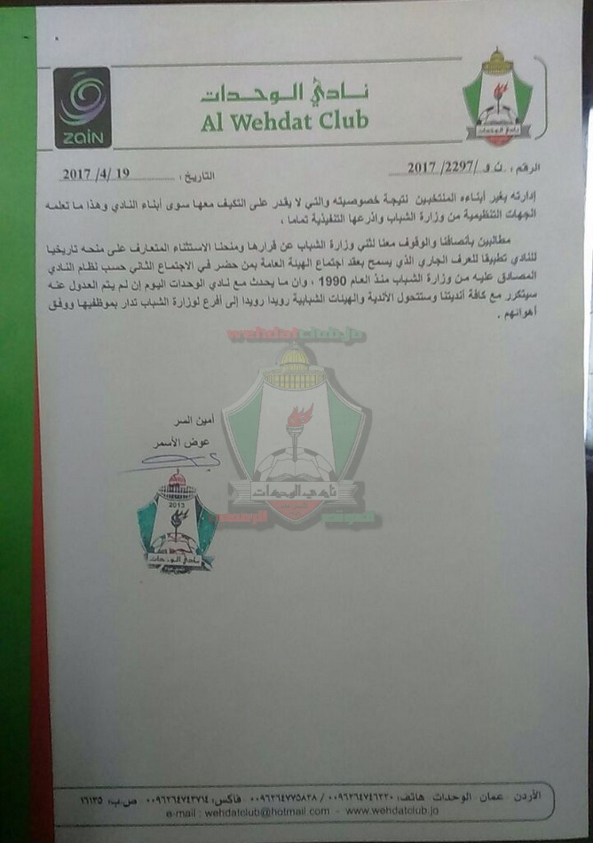 بيان صادر عن نادي الوحدات حول الكتاب الوارد للنادي من وزارة الشباب