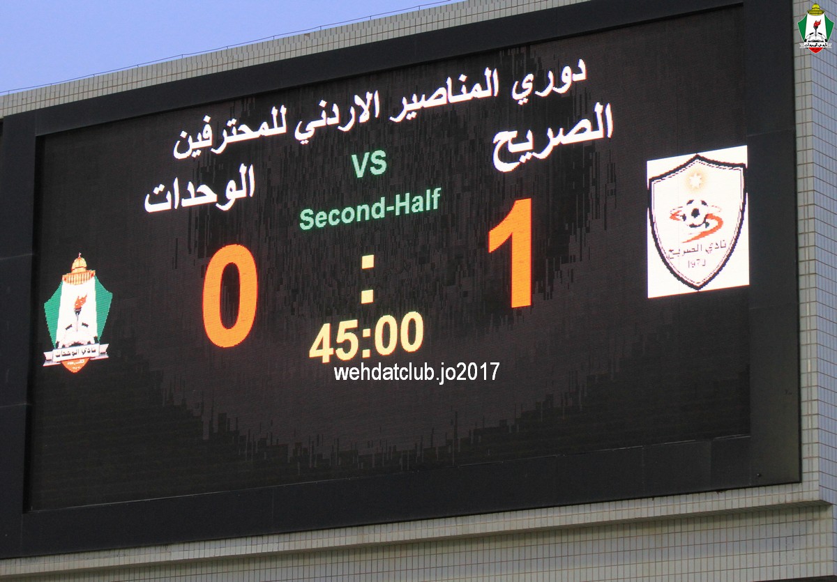 وسجل اهداف المباراة سبستيان بالدقيقة 68 للوحدات و فهد جاسر بالدقيقة 3 هدف الصريح وبهذا الفوز يرفع الوحدات رصيده الى 39 نقطة بالمركز الثالث خلف الجزيرة الذي هزم المنشية بهدف وحيد بالمباراة التي اقيمت على ستاد الامير علي مساء اليوم ليرفع رصيده الى 43 مما يعني فقدان الوحدات اللقب رسميآ.