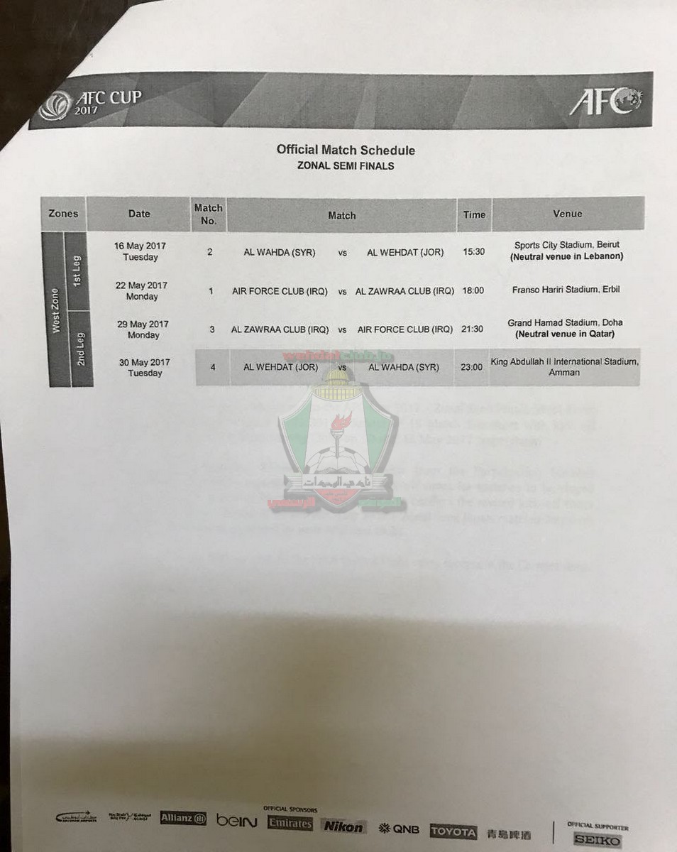 وافق الإتحاد الآسيوي لكرة القدم على تعديل موعد مباراة نادي الوحدات ونادي الوحدة السوري في إياب دور النصف نهائي من كأس الإتحاد الآسيوي لمنطقة غرب آسيا والتي ستقام يوم الثلاثاء بتاريخ 30/5/2017 لتقام الساعة الحادية عشرة مساءً على ستاد الملك عبدالله الثاني بمدينة القويسمة.