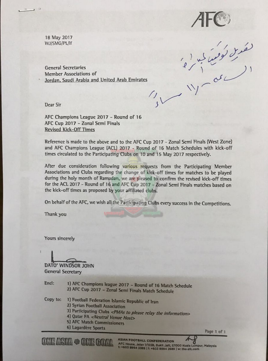 وحسب كتاب الرد الذي أرسل من قبل الاتحاد الآسيوي ردا على كتاب سابق مقدم من اتحاد الكرة ونادي الوحدات، فقد تقرر على الموعد المقترح للمباراة عند الحادية عشر مساء، وذلك بحسب تأكيد المنسق الإعلامي للنادي بسام شلباية.