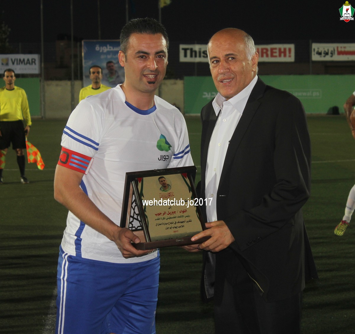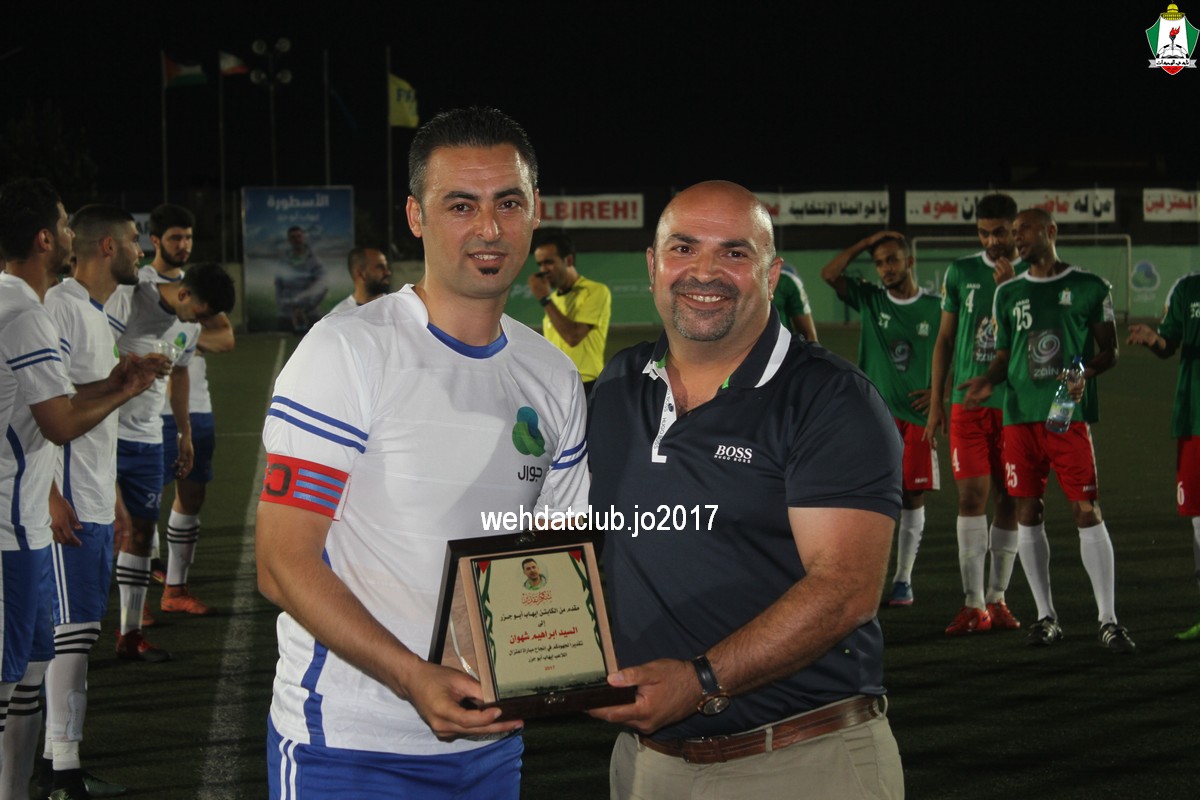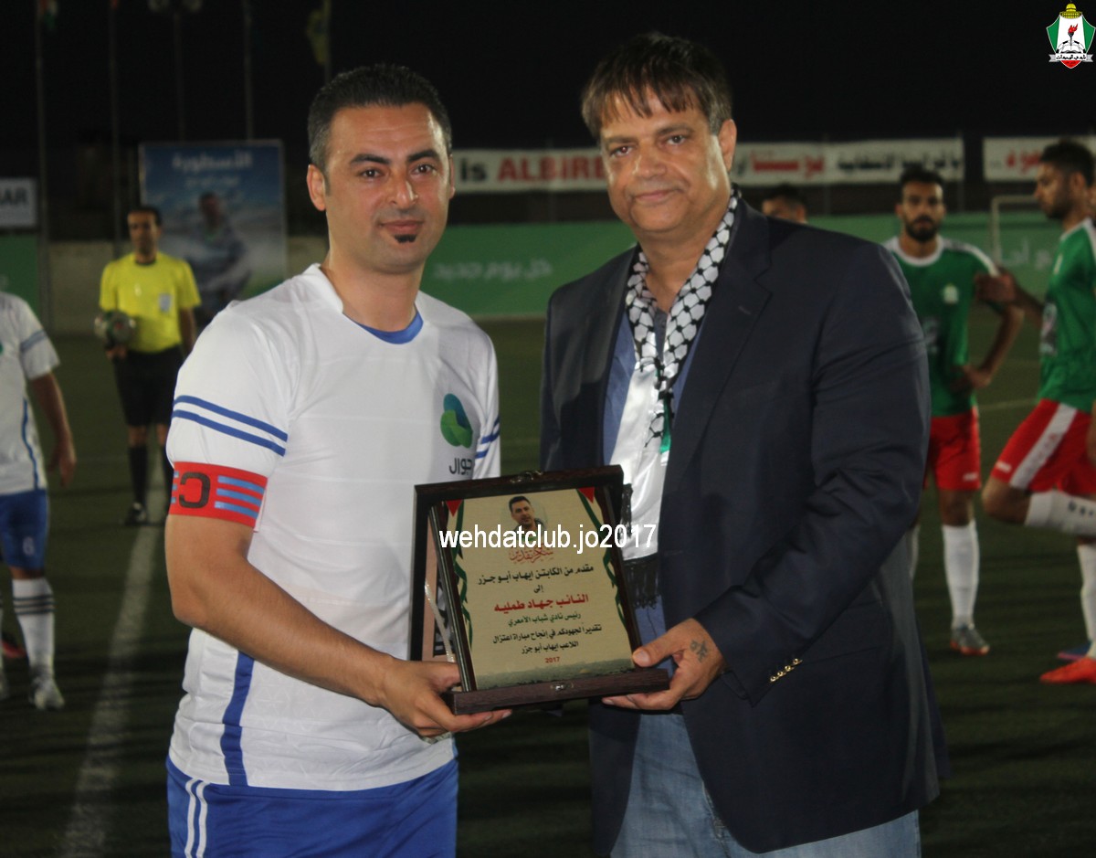 وبعد نهاية الشوط الأول تبادل رئيسان الناديان الدروع التذكارية بينهما ، وقدم العديد من حبين نادي الوحدات بالاراضي المحتلة الدروع والهدايا التذكارية لرئيس النادي يوسف الصقور.