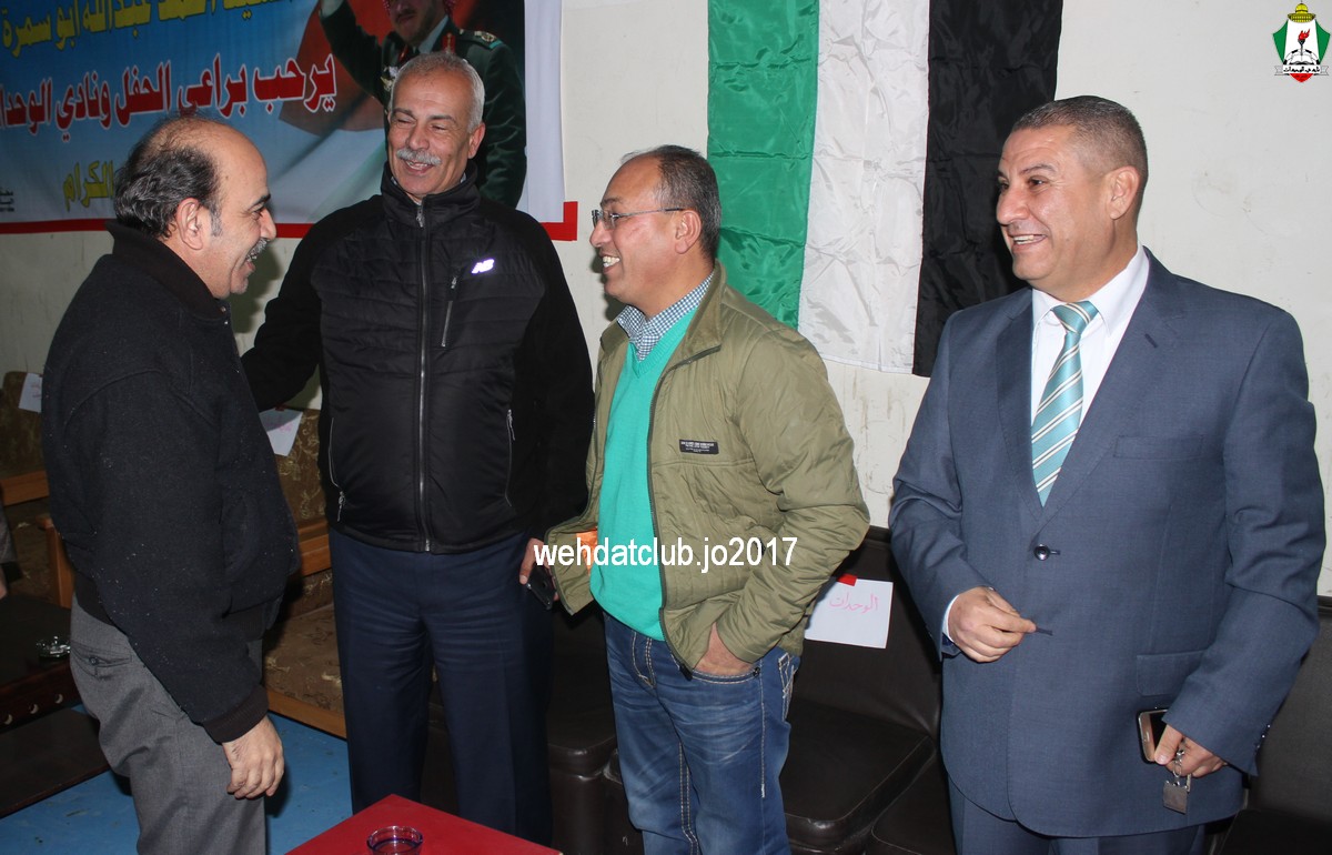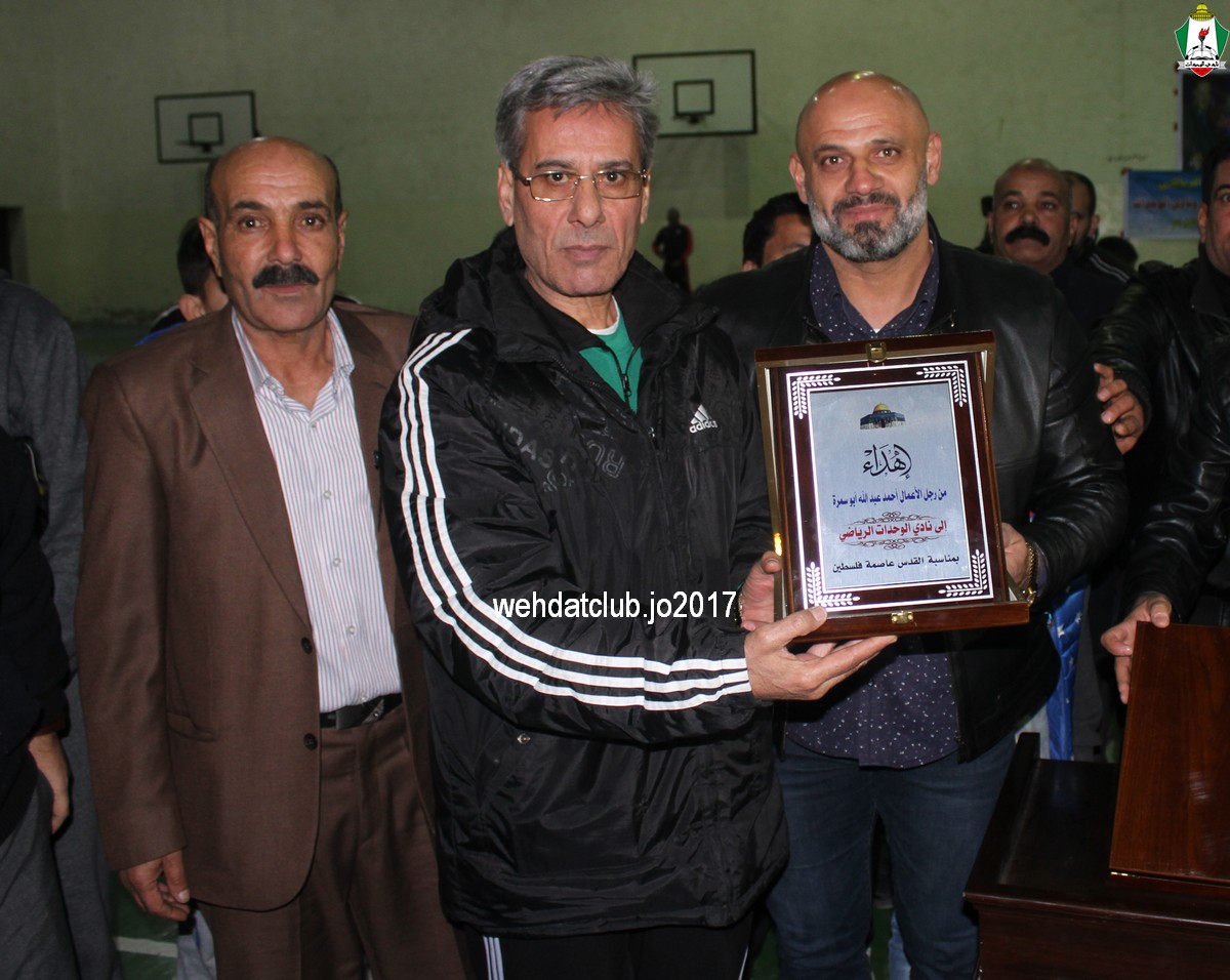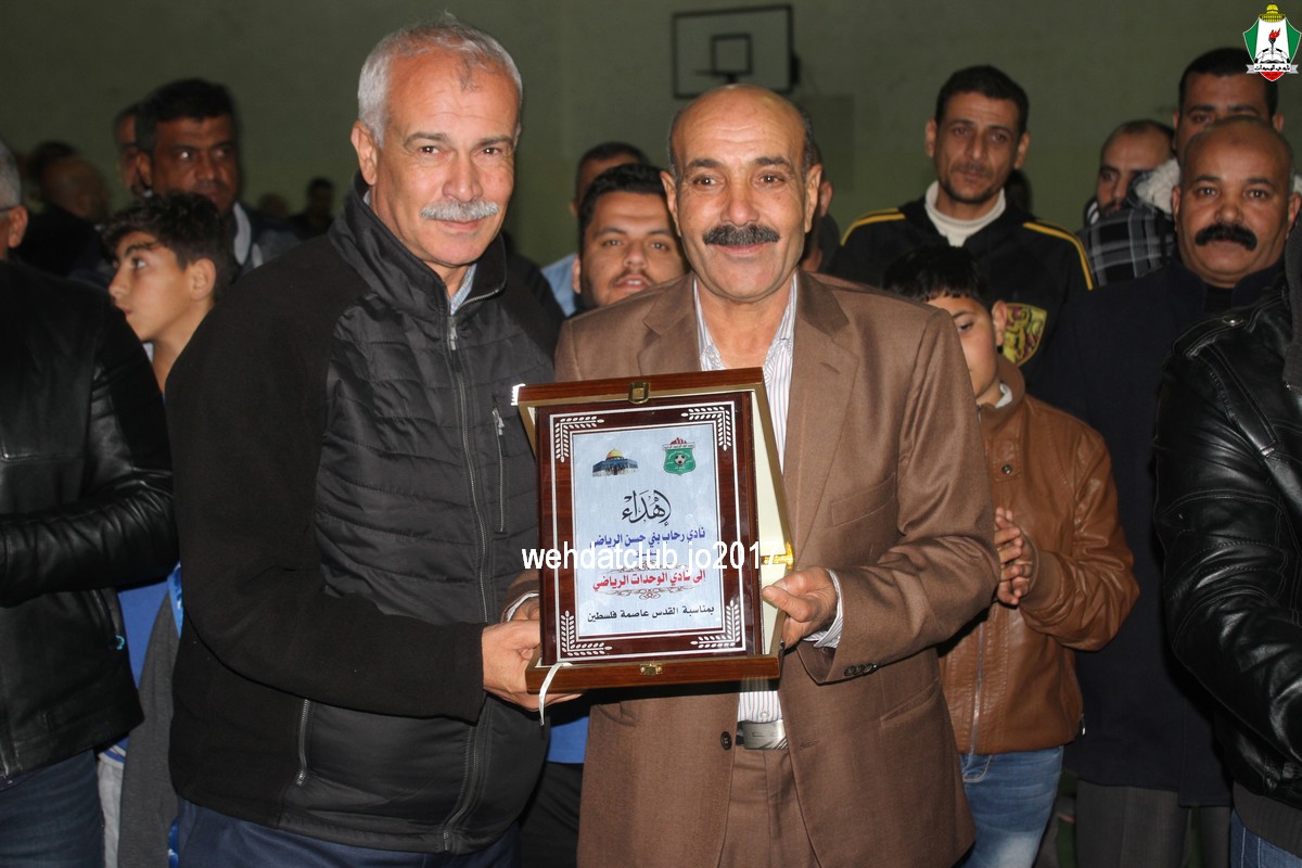 تحت رعاية سعادة النائب رائد الخزاعلة قام وفد نادي الوحدات بتلبية دعوة نادي رحاب الرياضي بمدينة المفرق والمشاركة في مهرجان “القدس عاصمة فلسطين” بإقامة مباراة ودية بين قدامى نادي الوحدات وقدامى محافظة المفرق والتي إنتهت بالتعادل الإيجابي (1-1) سجل محمود الخزاعلة هدف التقدم لقدامى المفرق وعادله قدامى الوحدات بقدم عامر ذيب ، والتي أقيمت في صالة فوزي الملقي وتجسيدا ودعما لشعار إحنا شعب مو شعبين والوقوف مع القضية والشعب الفلسطيني ضد قرار ترامب الجائر لصالح الكيان الصهيوني ، وتكون وفد الوحدات كلا من (مدير قطاع الفئات العمرية زياد شلباية و مدير اللجنة الثقافية عوض الأسمر و المستشار القانوني الدكتور ناصر العمرة واللاعبون خالد سليم،وليد قنديل،عامر ذيب،مروان الشمالي،محمد أبو داوود،غسان جمعة،جلال ملحم،عوض راغب،ماجد البسيوني،نادر زعتر،نائل عيد،عبدالكريم الشدفان،خالد أبو شرار) وكان في إستقبال الوفد رئيس نادي رحاب الرياضي السيد رافع حراحشة وسعادة النائب رائد الخزاعلة ورئيس بلدية المفرق عامر الدغمي ورئيس بلدية رحاب الدكتور حسين الزيود وداعم الحفل السيد أشرف أبو سمرة وأعضاء مجلس إدارة رحاب (محمود الجزازي،رائد خزاعلة،بسام الحراحشة،هاني الزبون،محمد الزبون،بسام عادل) وبحضور وجهاء وشيوخ وأهالي محافظة المفرق وقضاء بني حسن.