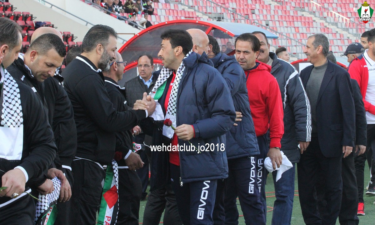 اللقاء اقام في اجواء مثالية و حمل الطابع الاخوي بين الفريقين تضامنأ من اهلنا في فلسطين الحبيبة واستغل الجهاز الفني لفريق الاول بقيادة جمال محمود المباراة ليدفع باكبر قدر من اللاعبين مع غياب نجوم المنتخب الاول و الاولمبي وجاءت التشكيلة الاساسية والتي شارك فيها نجما الأهلي المحترف الفلسطيني محمود وداي، والفيصلي سالم العجالين و كابتن الوحدات السابق عامر ذيب على النحو التالي : عامر شفيع بحراسة المرمى ، عمر قنديل ، باسم فتحي ، محمد الباشا ، سالم العجالين خط الدفاع احمد الياس ، عامر ذيب ثنائي الارتكاز معاذ العموري ، عبدالله ذيب ، محمود زعترة ثلاثي الوسط والفلسطيني محمود وداي مهاجم وحيد.
