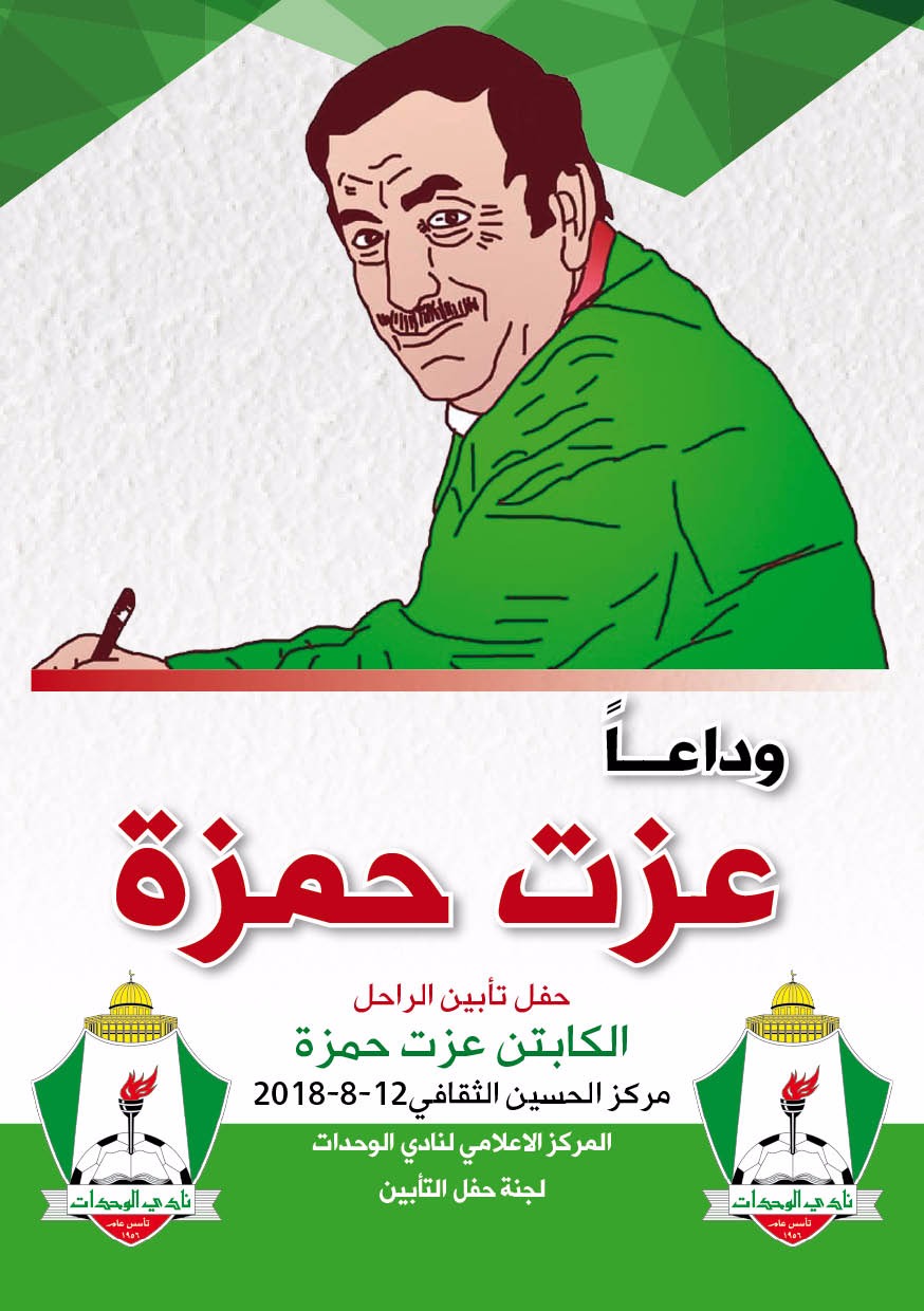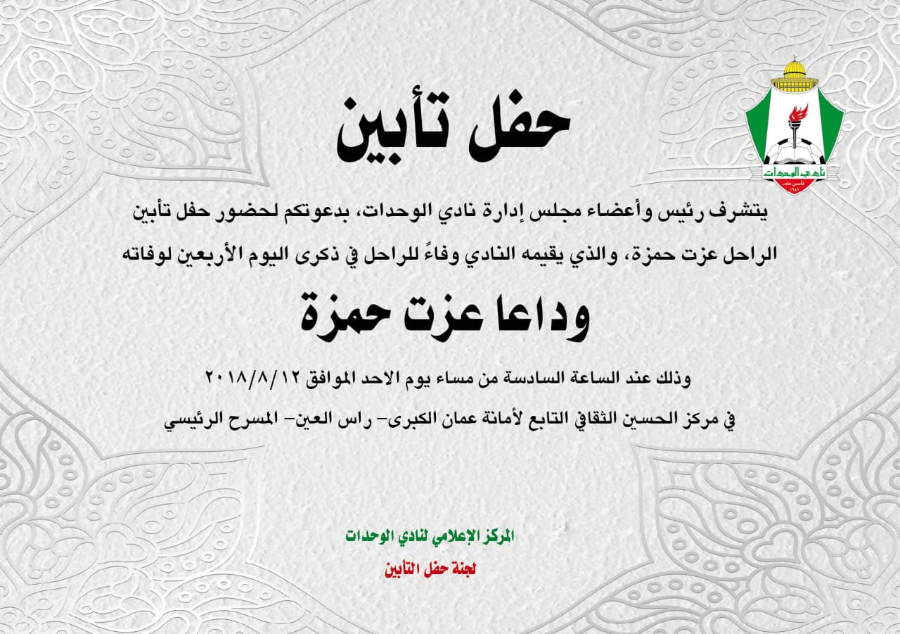 يتشرف رئيس واعضاء مجلس ادارة نادي الوحدات، بدعوتكم لحضور حفل تأبين الراحل عزت حمزة، والذي يقيمه النادي وفاءً للراحل في الذكرى الاربعين لوفاته