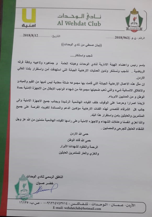 بأسم رئيس واعضاء الهيئة الادارية لنادي الوحدات وهيئته العامة و جماهيره و لاعبيه و كافة فرقه الرياضية نشجب ونستنكر وندين العمليات الارهابية الجبانة التي استهدفت امن واستقرار بلدنا الغالي الاردن.