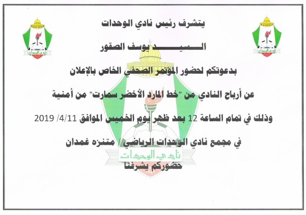 وبحسب الناطق الرسمي لنادي الوحدات خضر صوان الذي أفضى بالخبر، قال:” أنجز نادي الوحدات كافة الترتيبات لهذا المؤتمر المهم، ووجه رقاع الدعوة الى عديد الجهات والشخصيات الإعلامية، وسيخصص المؤتمر للحديث عن شراكة النادي وامنية فيما يخص الإعلان عن أرباح النادي الناجمة عن شراكة الجانبين في إطلاق “خط المارد الاخضر سمارت”، وذلك لوضع محبي وانصار النادي في صورة هذا الاستثمار من جميع جوانبه”.